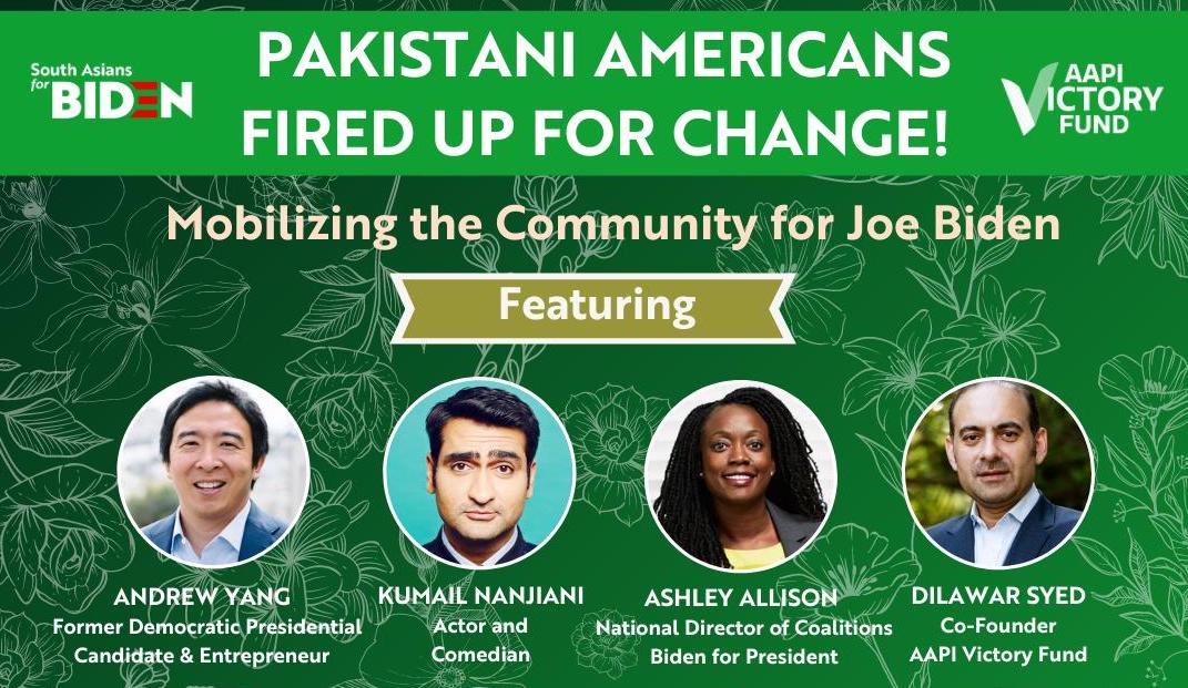The "Community fired up for change" event featured former presidential nominee Andrew Yang; Qasim Rashid, Democratic nominee in Virginia's 1st congressional district; Ashley Allison, national coalitions director for the Biden campaign; actor and comedian Kumail Nanjiani; and writer Wajahat Ali, among others.
