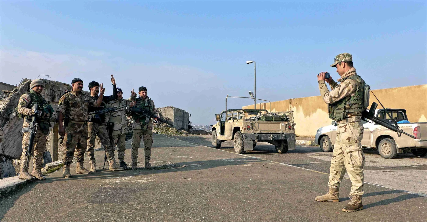 In the late afternoon sunshine, Iraqi soldiers, taking a break from the Mosul frontline, pile out of Humvees to pose for selfies by the ruins of the once-famous shrine of Jonah’s Tomb.