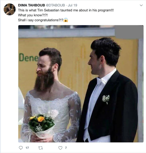 She later tweeted a picture of a gay couple getting married, commenting: "This is what Tim Sebastian taunted me about in his program!!! What do you know?!?! Shall I say congratulations?!?"