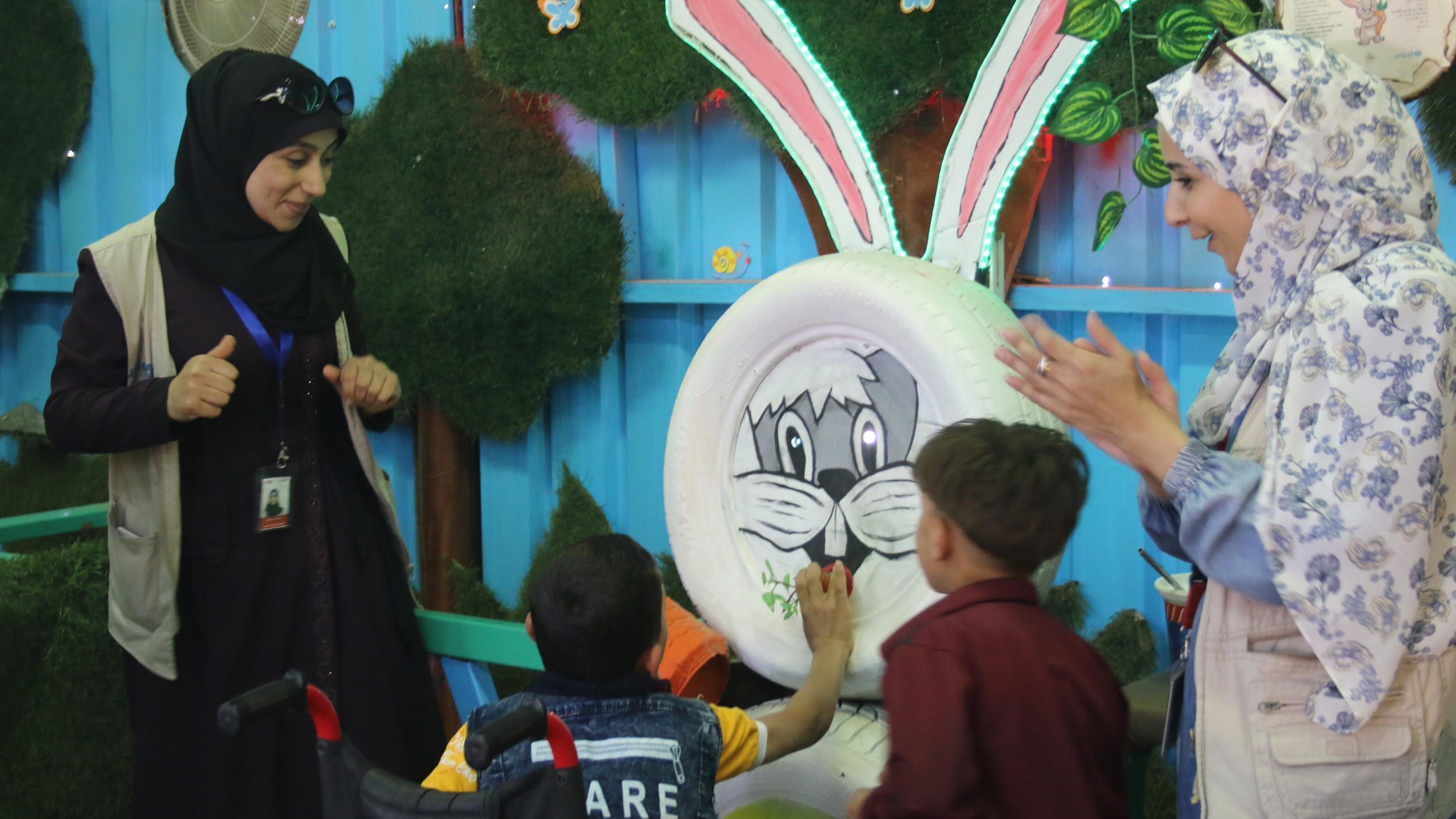 One of the first visitors to the new playground was eight-year-old Ahmad Ali, who has cerebral palsy and uses a wheelchair. He was introduced to a frog made out of tyres, and a programme officer showed him how to shake the frog's mechanical arm.
