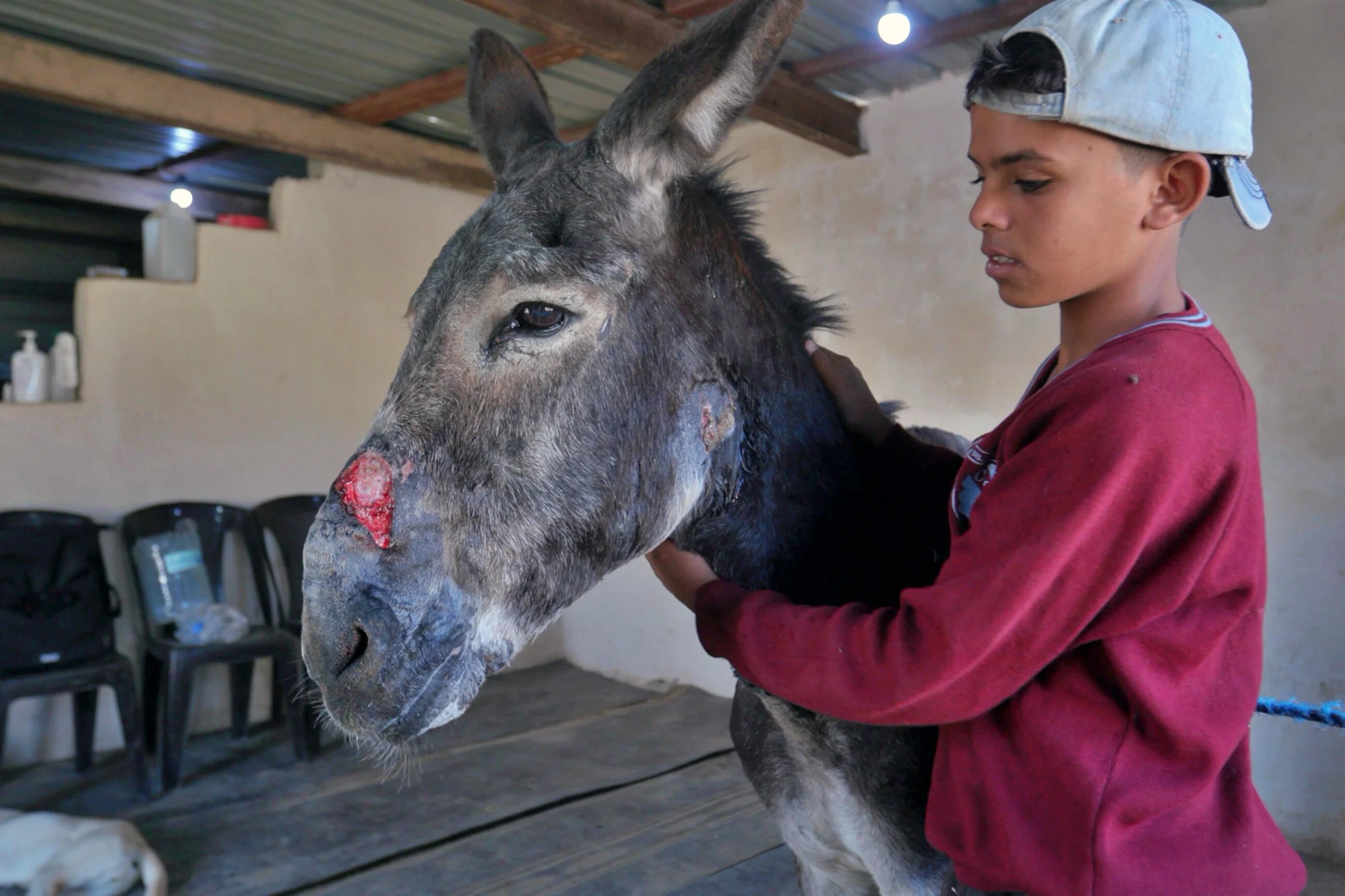 Abdelrahman Atallah, a 14-year-old volunteer, helps soothe a donkey that is receiving treatment at the PETA animal clinic in Petra after being injured in a fight with another donkey over food.