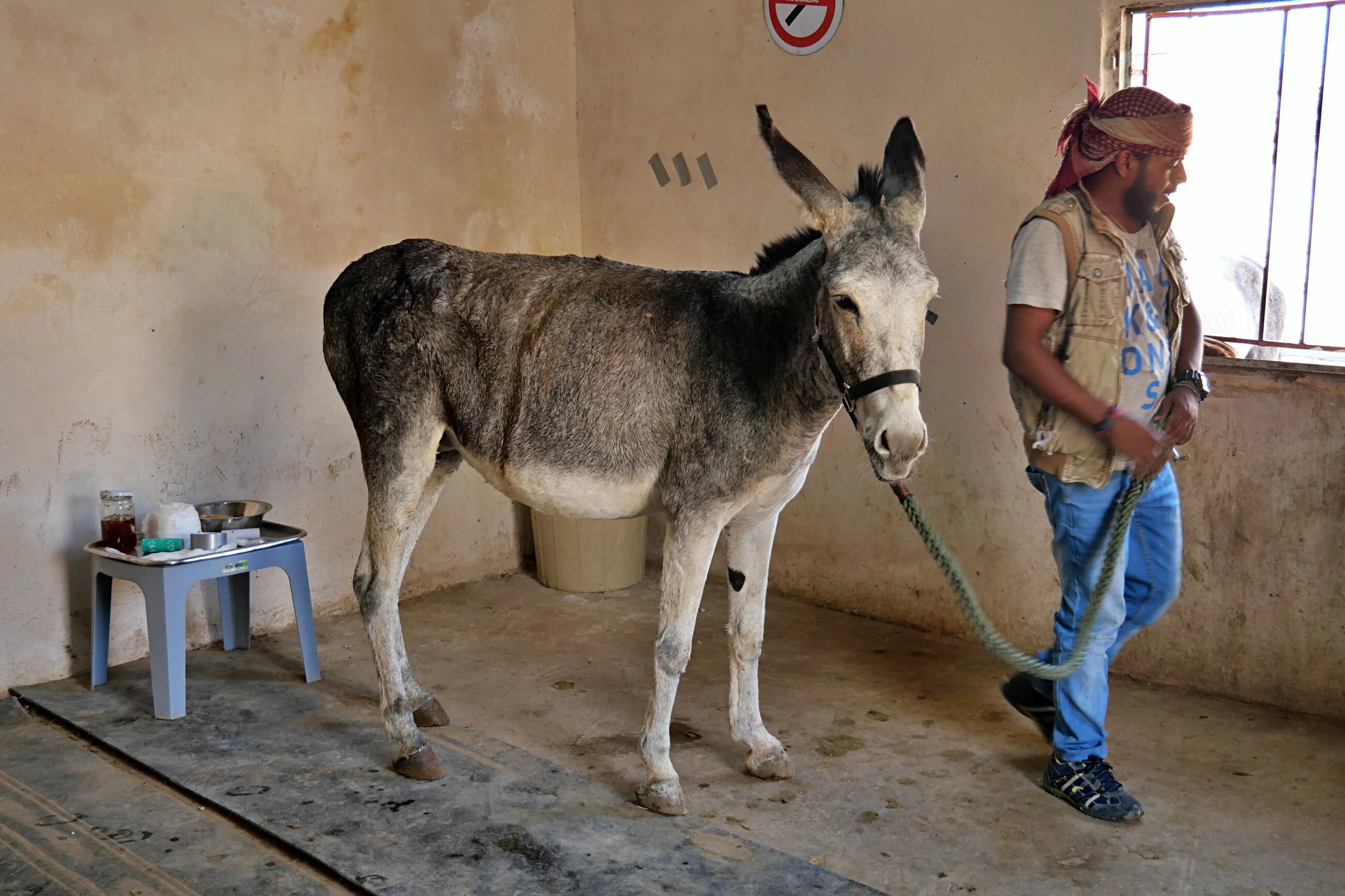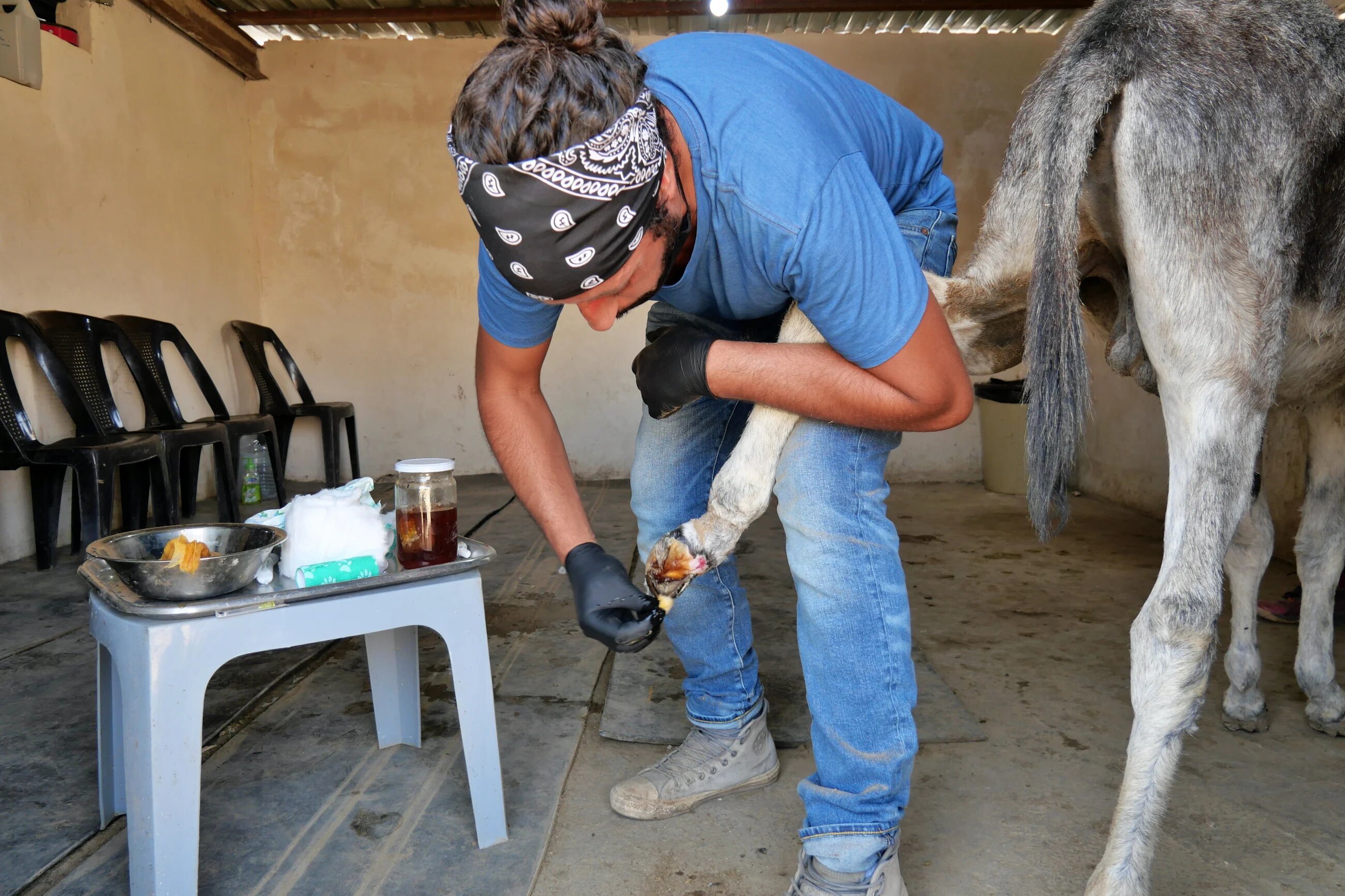 Veterinarian Shata treats a donkey with a detached hoof. The donkey is recovering well now that it is receiving the correct medical treatment, but it will take many months before it is able to walk properly again.