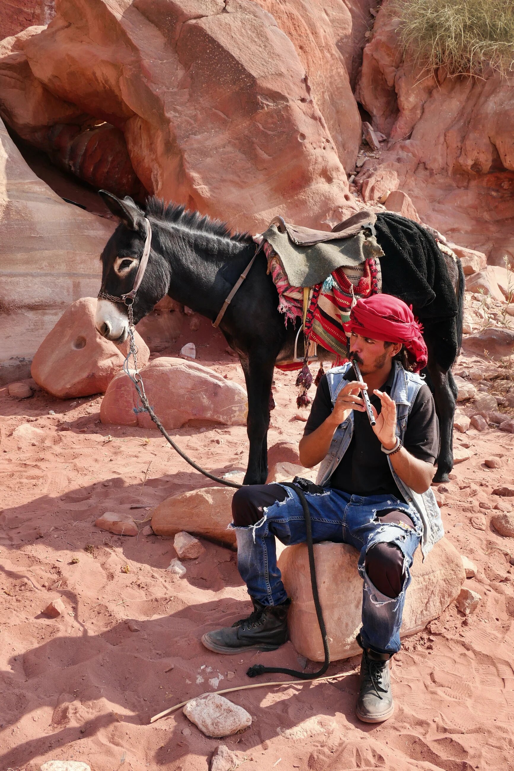 Bedouin Tariq Mohammad plays his flute while sitting next to his donkey in Petra. Riding donkeys, and using them to carry burdens such as water and wood, are a normal way of life here.
