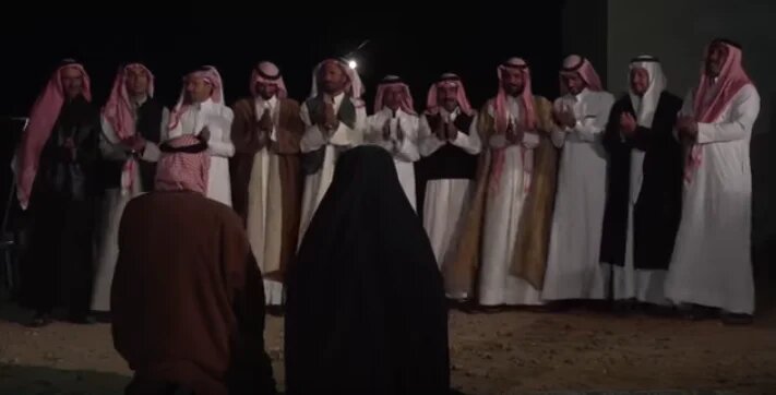 A veiled woman - one of the relatives invited to the wedding - known as al-Hashi then sings and dances in an abaya in front of the line of wedding attendees. Before long, another person, one of al-Hashi's male relatives, known as the Wasq al-Hashi, takes her sleeve and asks her to sit down.