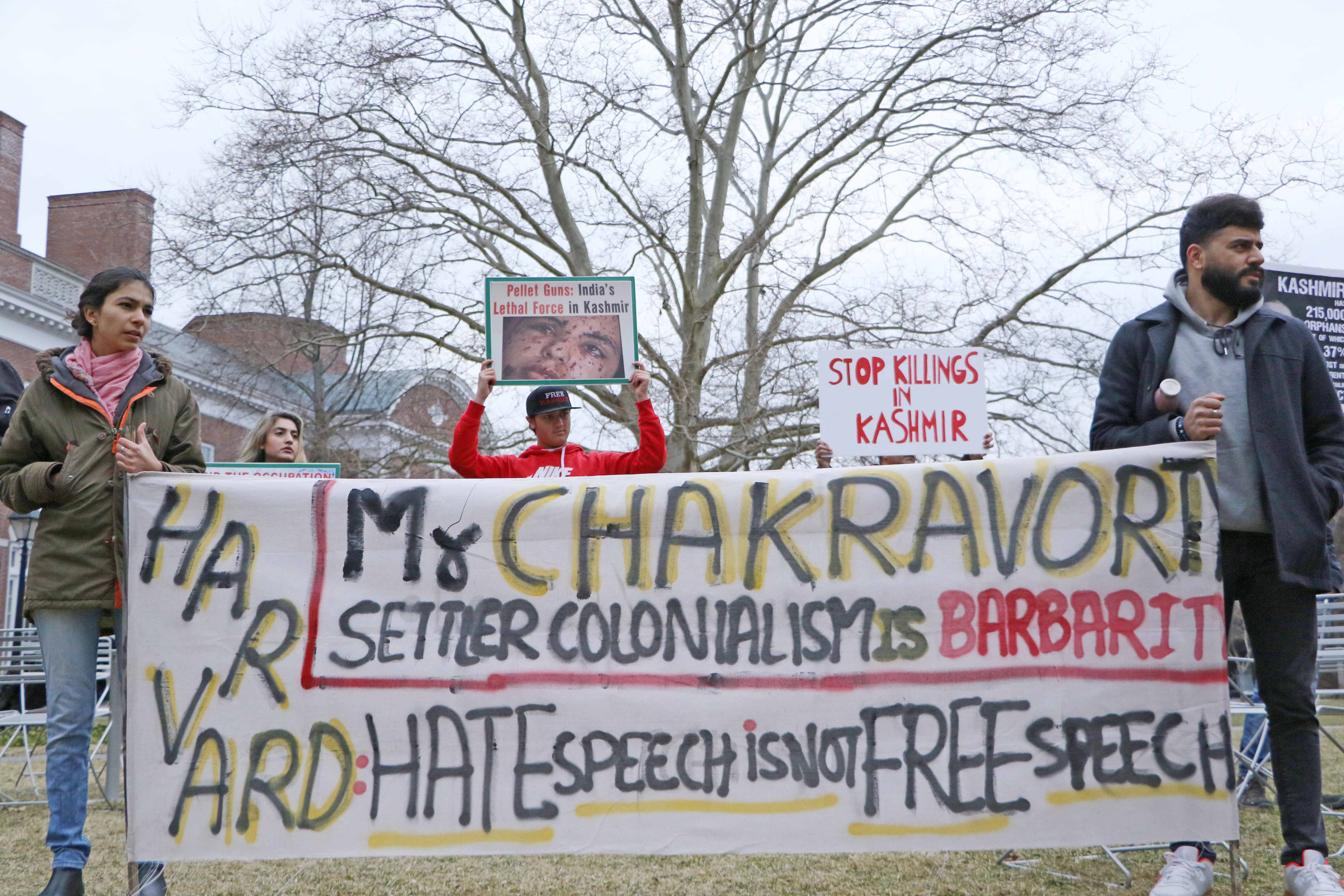 The protesters gathered at Harvard Square in front of Aldridge Hall, where Indian envoy Sandeep Chakravorty was speaking, and set up banners reading "Stand With Kashmir" and "Settler-colonialism is barbarity".