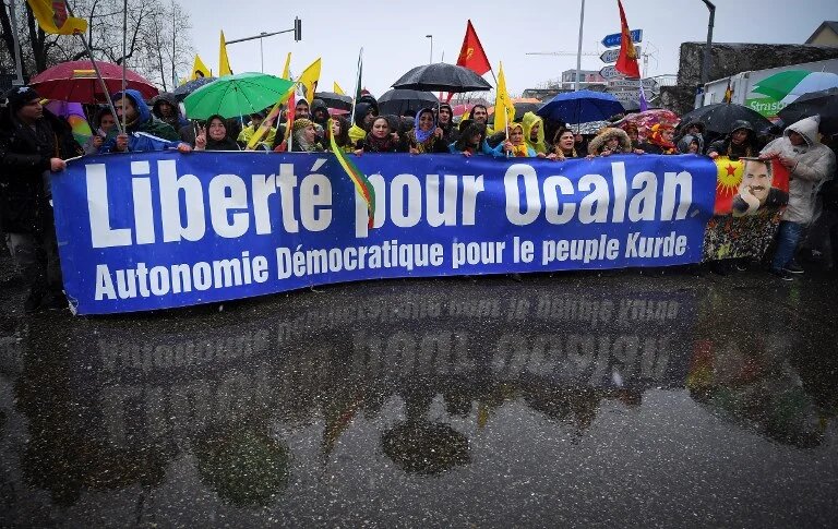 The protesters who came from across Europe also waved Kurdish flags and pictures of the leader of the outlawed Kurdistan Workers' Party (PKK), chanting "Freedom for Ocalan".