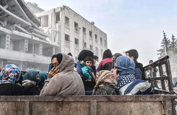 Civilians sit in the back of a truck as they flee the city of Afrin in northern Syria on March 18 (AFP)