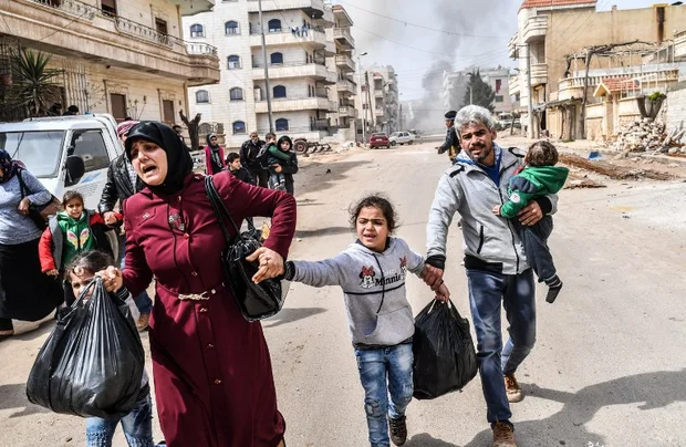 Civilians run for cover from explosions in the city of Afrin in northern Syria on March 18, 2018, after Turkish forces and their rebel allies took control of the Kurdish-majority city (AFP)