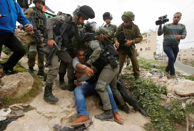 Israeli troops detain a Palestinian demonstrator during a protest marking Land Day in the West Bank city of Hebron (Reuters)