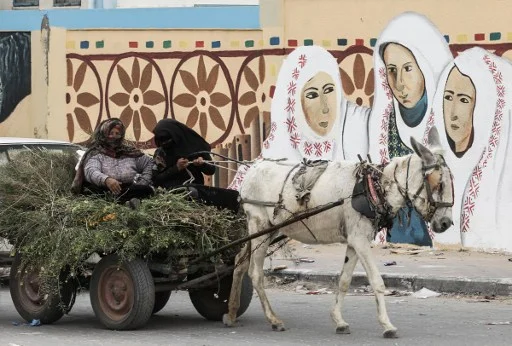 Palestinian women ride a donkey and cart past a mural along a street in Rafah, in the southern Gaza Strip, on Land Day (AFP)