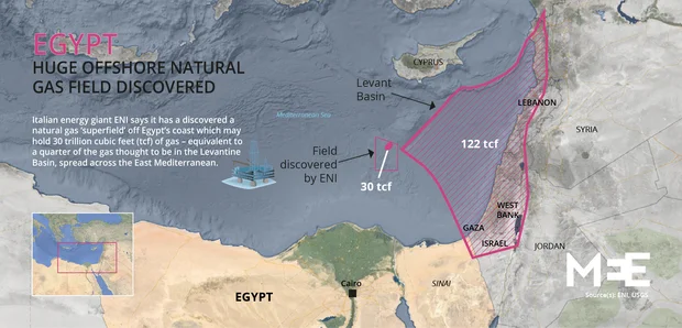 In the Levantine Basin, an East Mediterranean offshore area adjacent to Egypt's territorial waters and along the coastlines of Syria, Jordan, Lebanon, Israel, the Occupied Territories and Cyprus, geologists have estimated that there is at least 122 tcf of natural gas - or four times the amount found alone in Zohr.