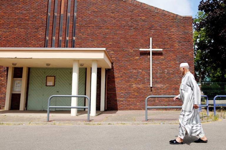 A Muslim man walks by Sainte-Therese church in Saint-Etienne-du-Rouvray following Tuesday's attack in the town that left an 86-year-old priest dead (AFP)