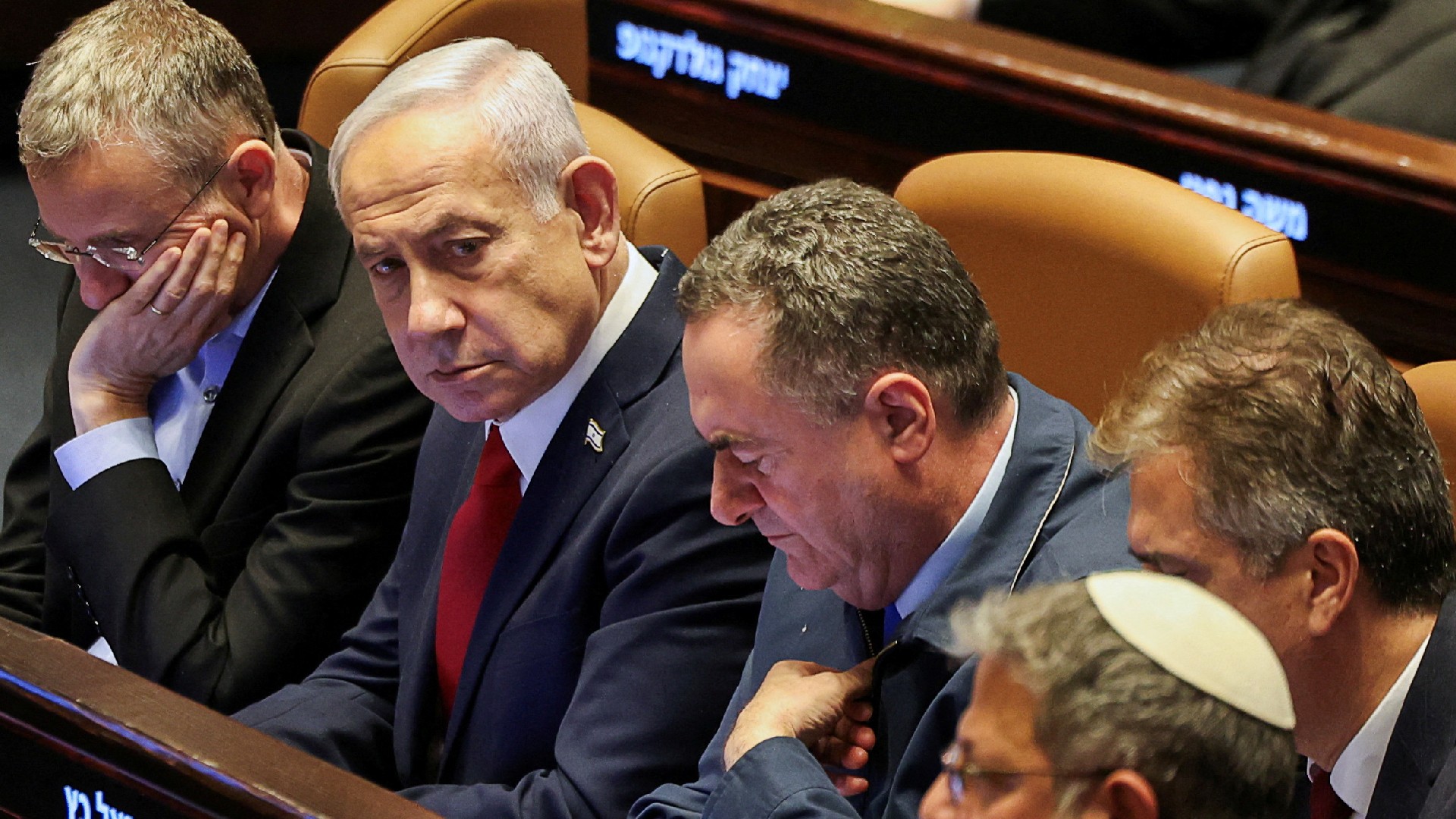 Israeli Prime Minister Benjamin Netanyahu (second from left) attends a discussion in the Knesset in Jerusalem, on 23 July 2025 (Reuters/Ronen Zvulun)