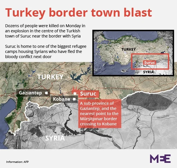 The explosion appears to have been aimed at a press conference held for a group of 300 members of the Federation of Socialist Youth Organisation (SGDF) who were planning to visit the Syrian border town of Kobane to do volunteer work over the summer.
