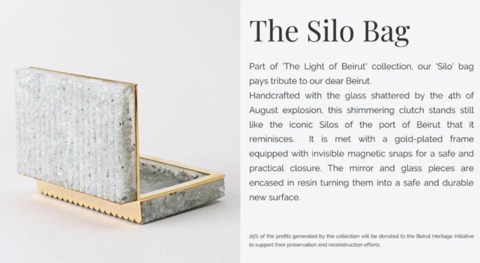 “Handcrafted with the glass shattered by the 4th of August explosion, this shimmering clutch stands still like the iconic Silos of the port of Beirut that it reminisces,” the description on the website read.