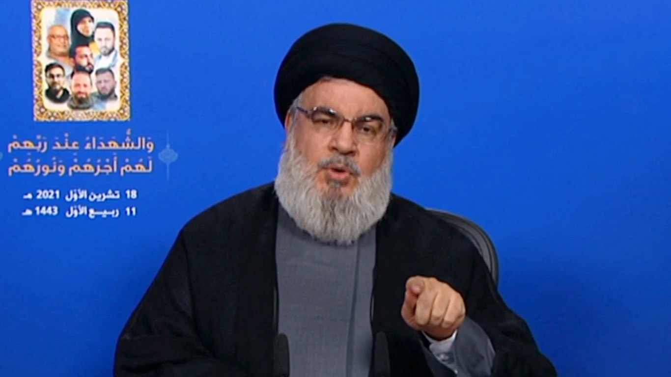 Hezbollah's Hassan Nasrallah delivers a televised speech from an undisclosed location on 18 October 2021.