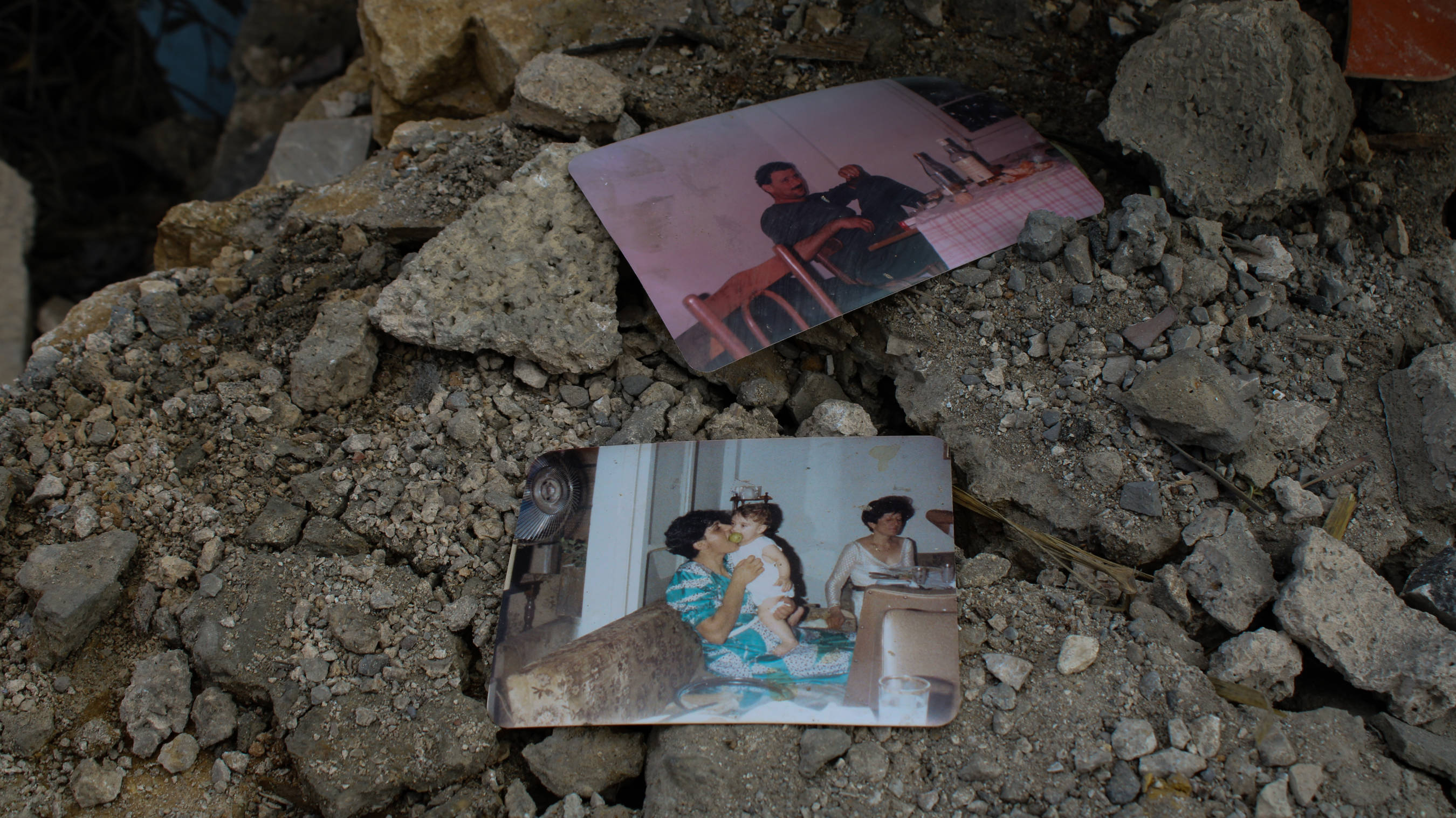Childrens’ clothes, likely blown out in the blast, hung on olive trees, broken and coated in grey cement dust. Next to blood-soaked stones were spoons, shoes, coffee pots, and family photos.