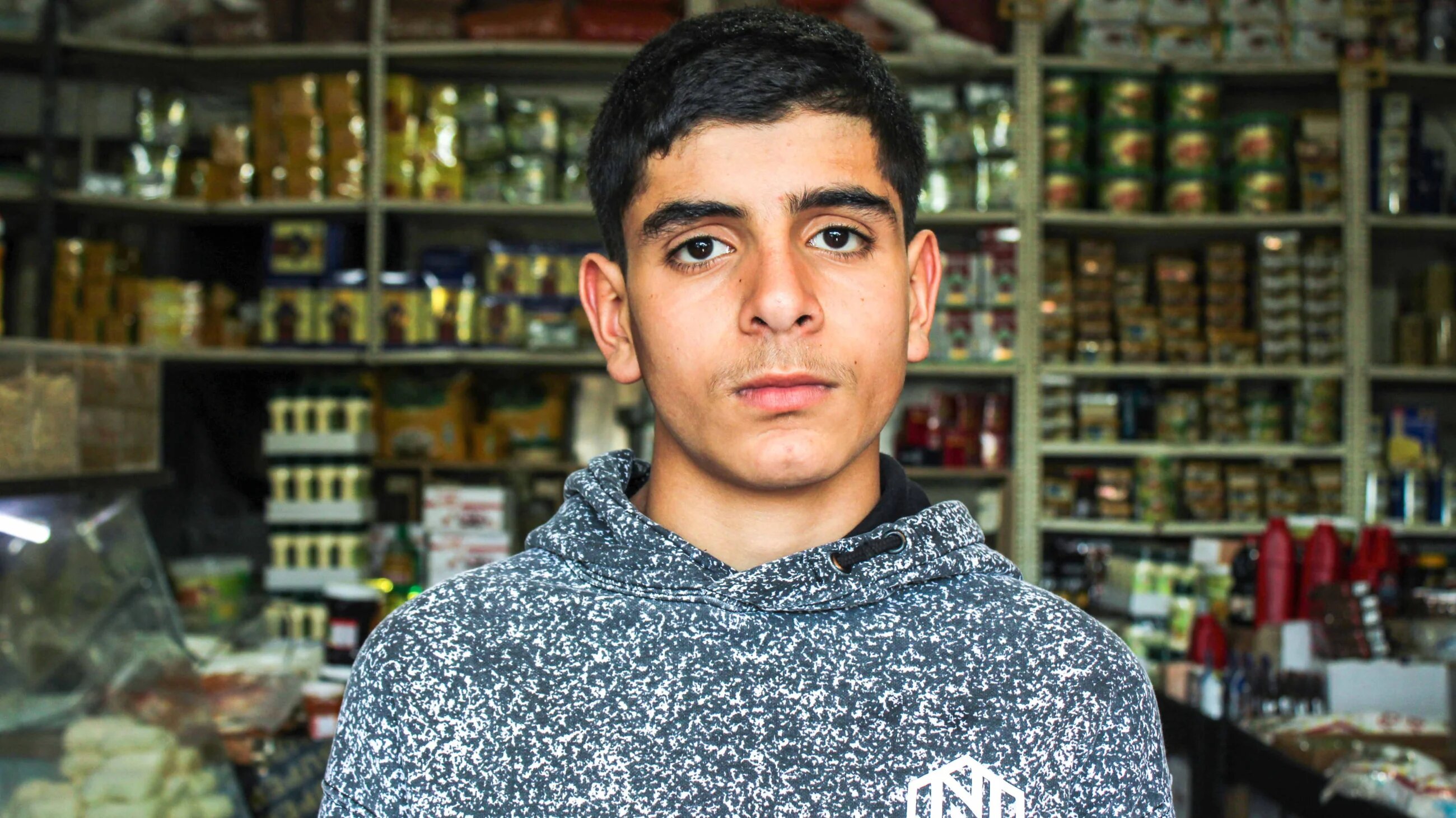 At 8.30pm on 23 April, 13-year-old Sajed and 18-year-old Youssef were helping in their father's shop, when they saw a group of armed men with metal bars and handguns assaulting an unknown Syrian man outside.