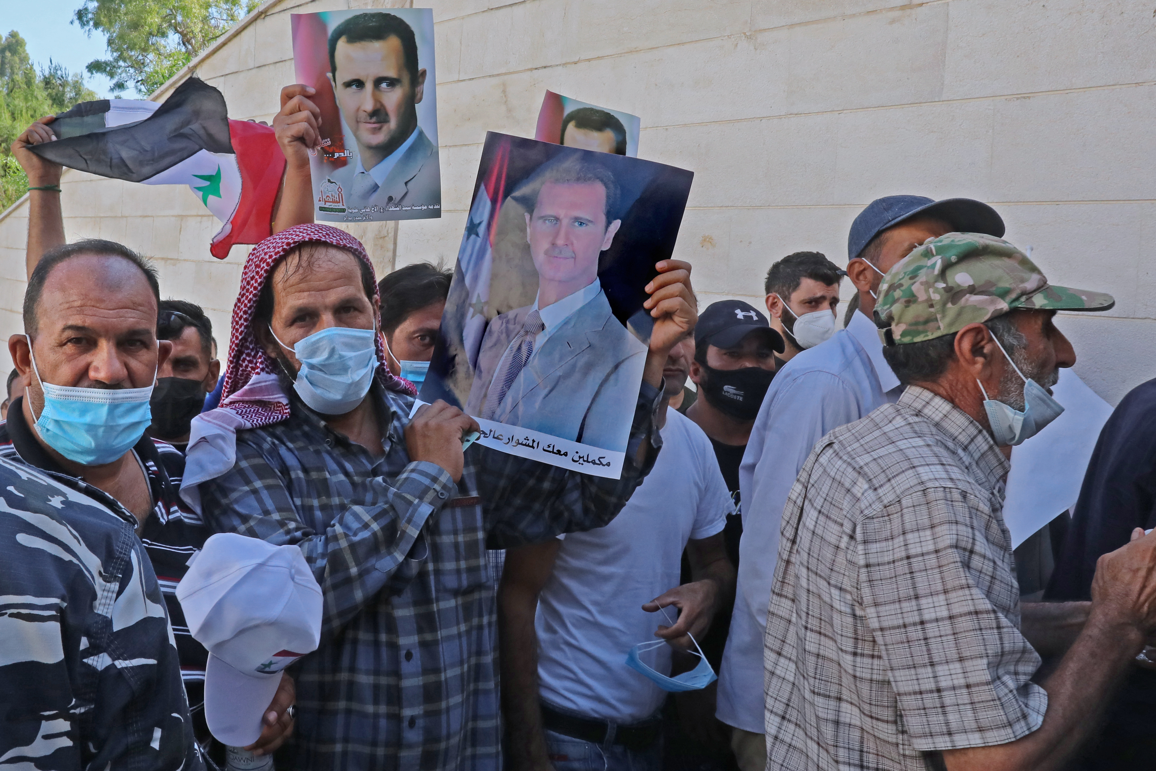 Syrian voters residing in Lebanon carry portraits of President Bashar al-Assad before registering to vote at the Syrian embassy on the outskirts of the Lebanese capital Beirut on 20 May 2021 (AFP)