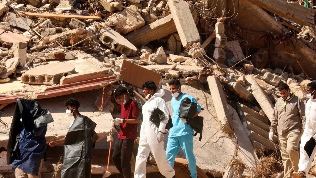 Rescuers carry body bags as they walk in front of buildings that collapsed during floods after the Mediterranean Storm Daniel hit Libya's eastern city of Derna, on 14 September 2023 (AFP)
