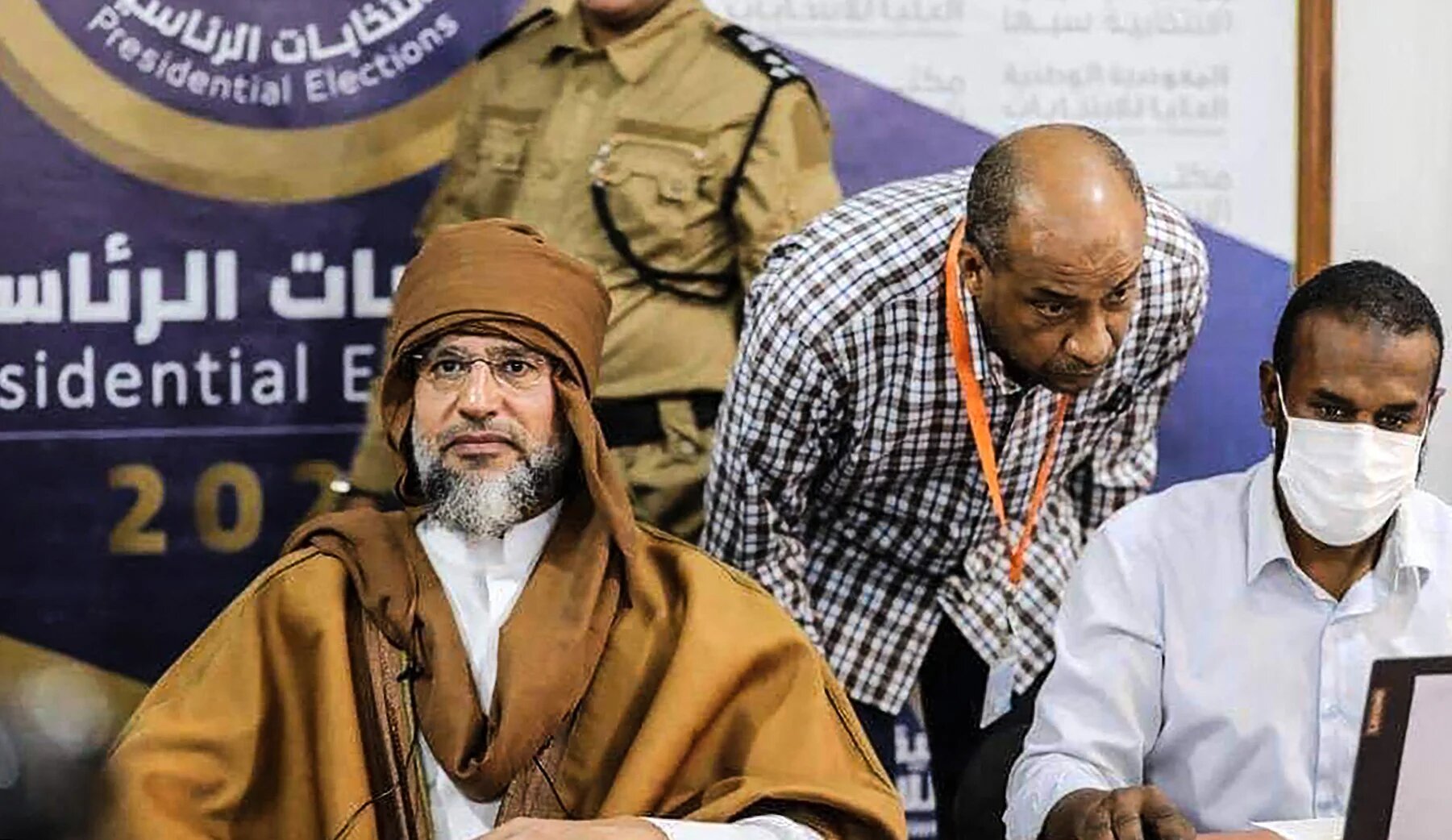 The 49-year-old, who is wanted for crimes against humanity by the International Criminal Court, appeared in an electoral commission video in traditional brown robe and turban, and with a grey beard and glasses, signing documents at the election centre in the southern town of Sebha.