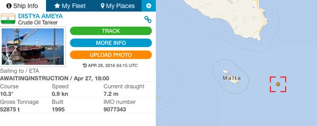 Open source maritime tracking software shows that the Distya Ameya is currently anchored off the east coast of Malta, and is “awaiting instruction” as to where to sail to next.