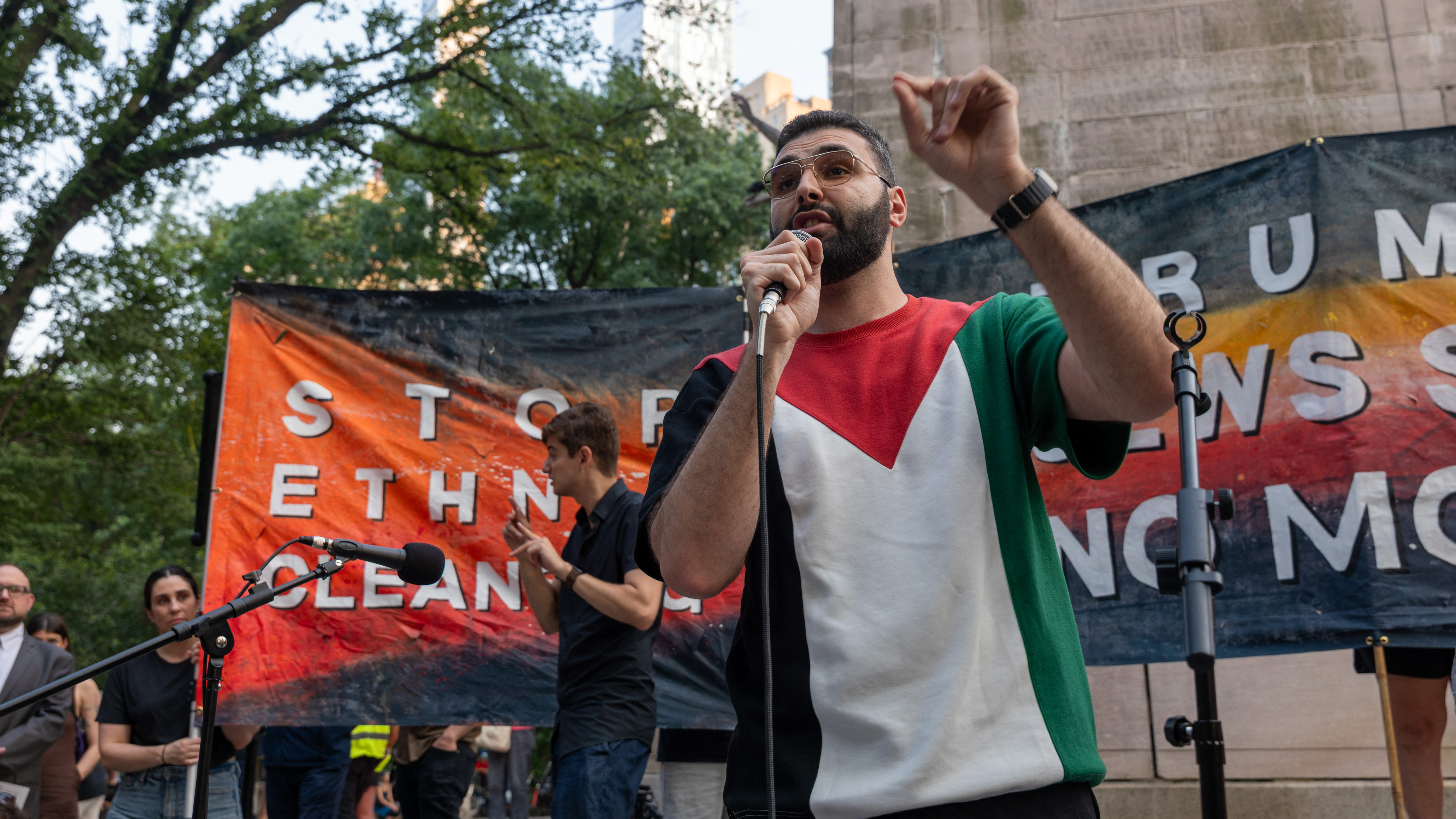 Photojournalist Motaz Azaiza speaks at a rally protesting the war in Gaza on 4 August 0 in New York City (Spencer Platt/AFP)