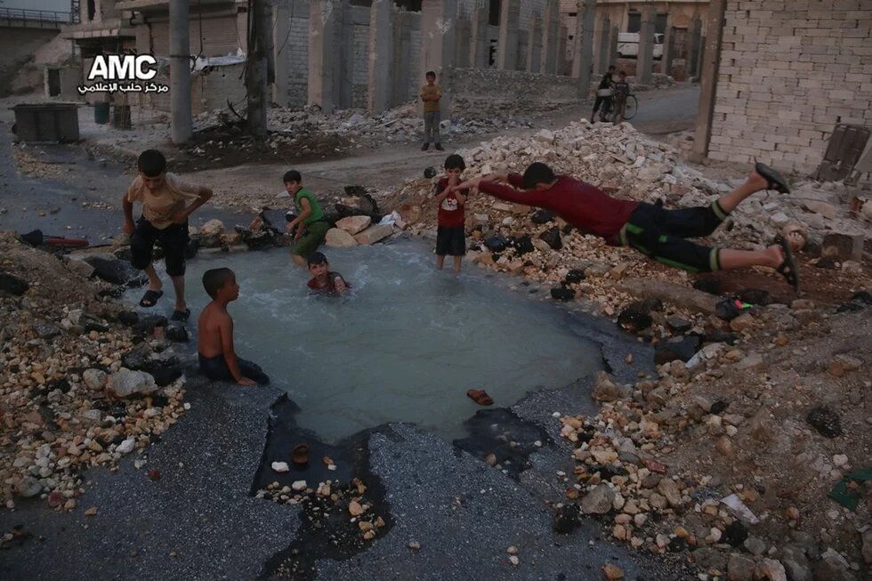 Photos published by the Aleppo Media Centre showed several children playing in a crater, caused by an air strike, that had filled with water from a burst pipe.