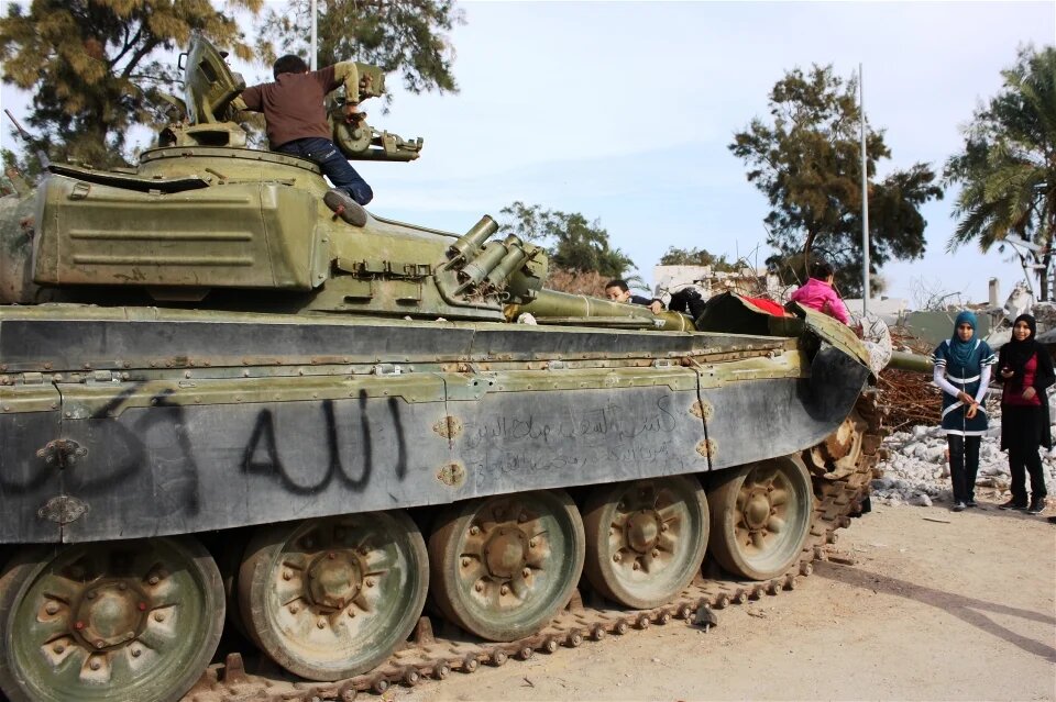 Children play on a tank amid the remains of Gaddafi’s luxurious compound in Tripoli (IRIN)