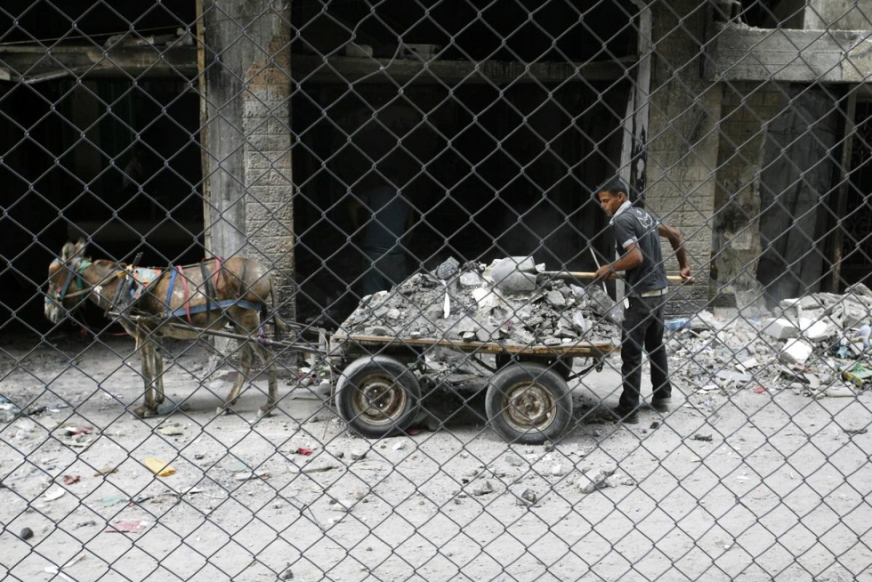 A Palestinian man pulls rubbles to horse-drawn carriage in Rafah, Gaza, on 23 September 23, 2014 (AA)