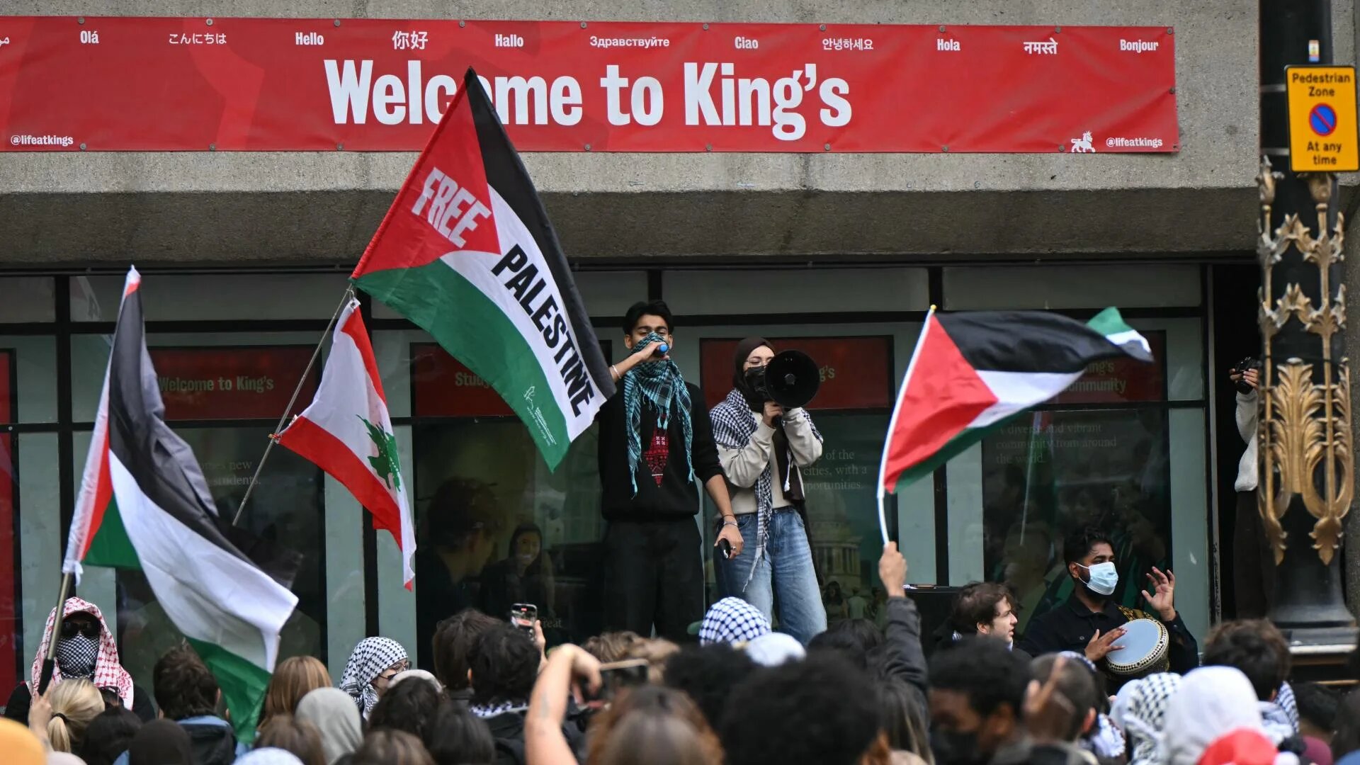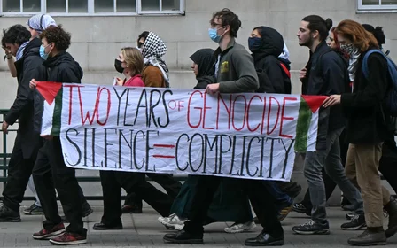 Pro-Palestinian student protesters outside King's College London during a march for Gaza on 7 October 2025 (AFP)