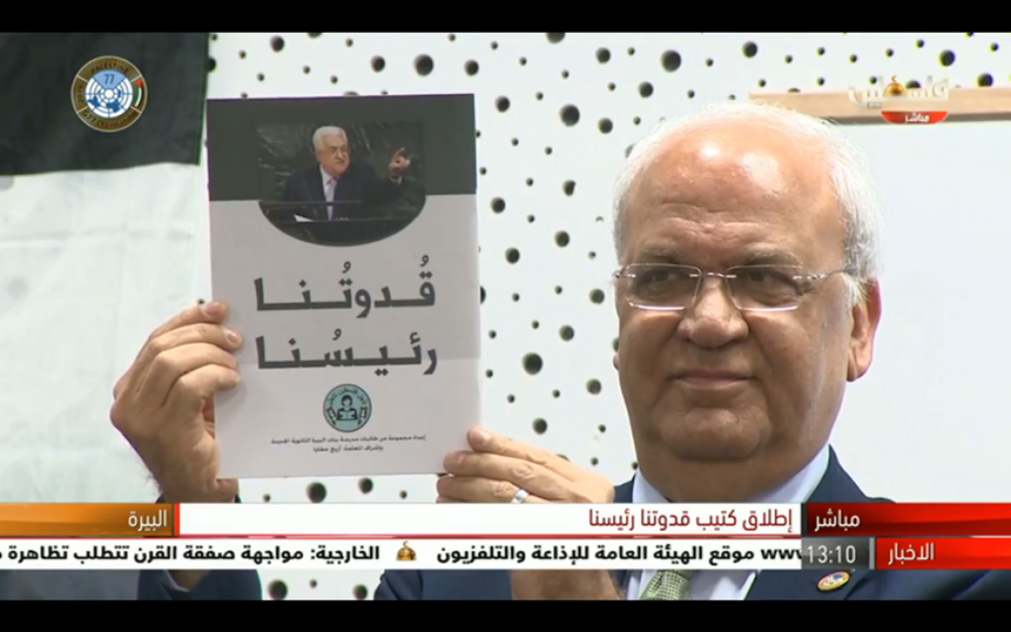 The booklet features a picture of Abbas pointing a warning finger in one of his speeches at the UN General Assemby, and will be distributed throughout Palestinian Authority-run schools in the occupied West Bank.