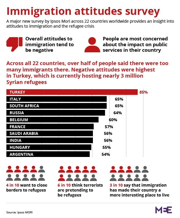 Negative attitudes towards immigration were generally highest in Turkey, which is currently hosting nearly three million Syrian refugees.