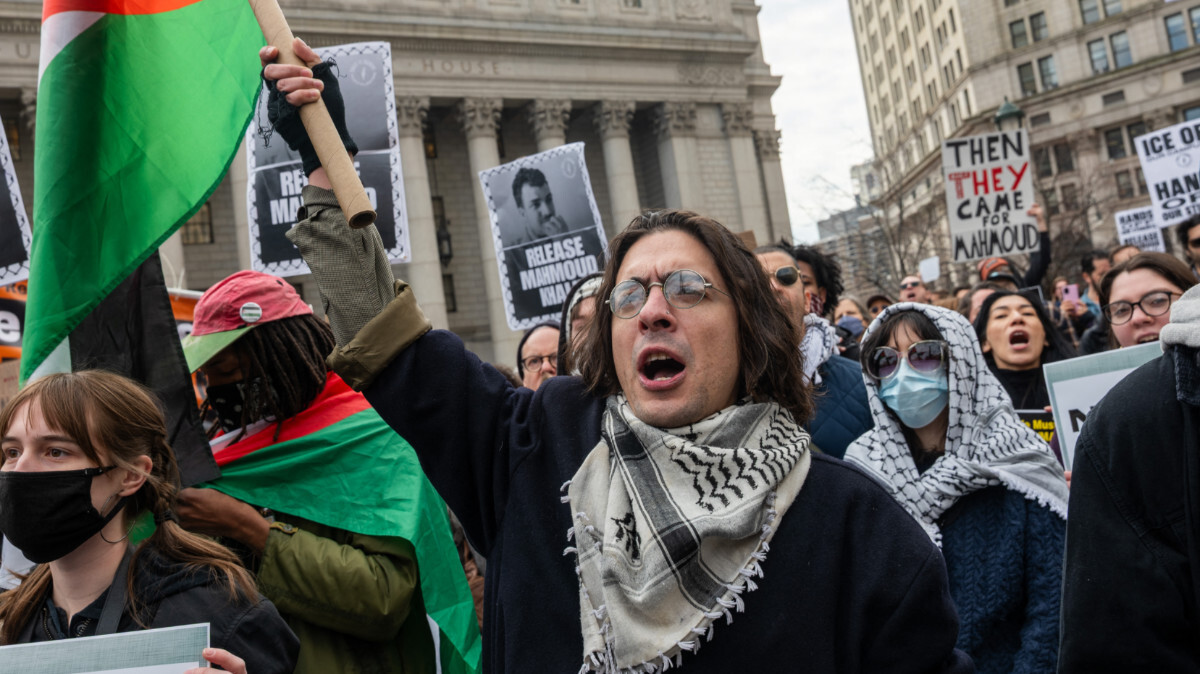 Hundreds demonstrate outside a New York City court to protest against the arrest and detention of Mahmoud Khalil, a Palestinian green card holder and recent Columbia University graduate who played a role in pro-Palestine protests at the university, on 12 March 2025 (Spencer Platt/Getty Images via AFP)