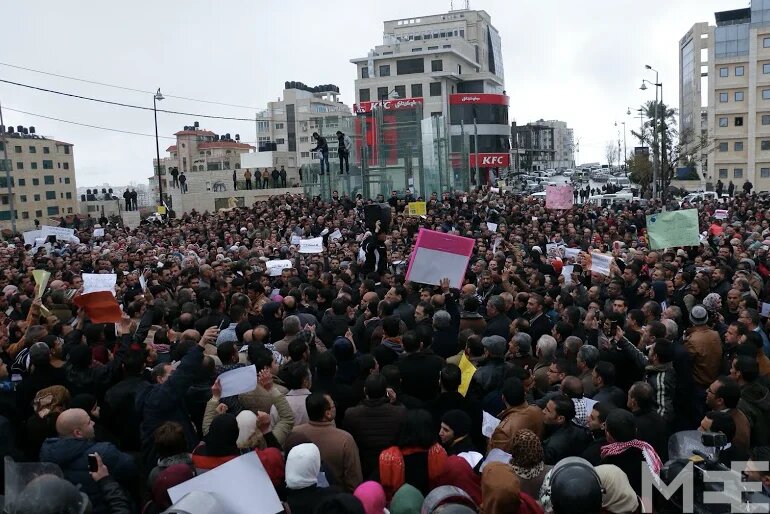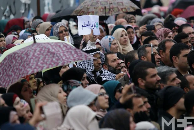 Despite the rain, teachers from across the West Bank showed up to protest about pay (MEE / Mustafa Harish)