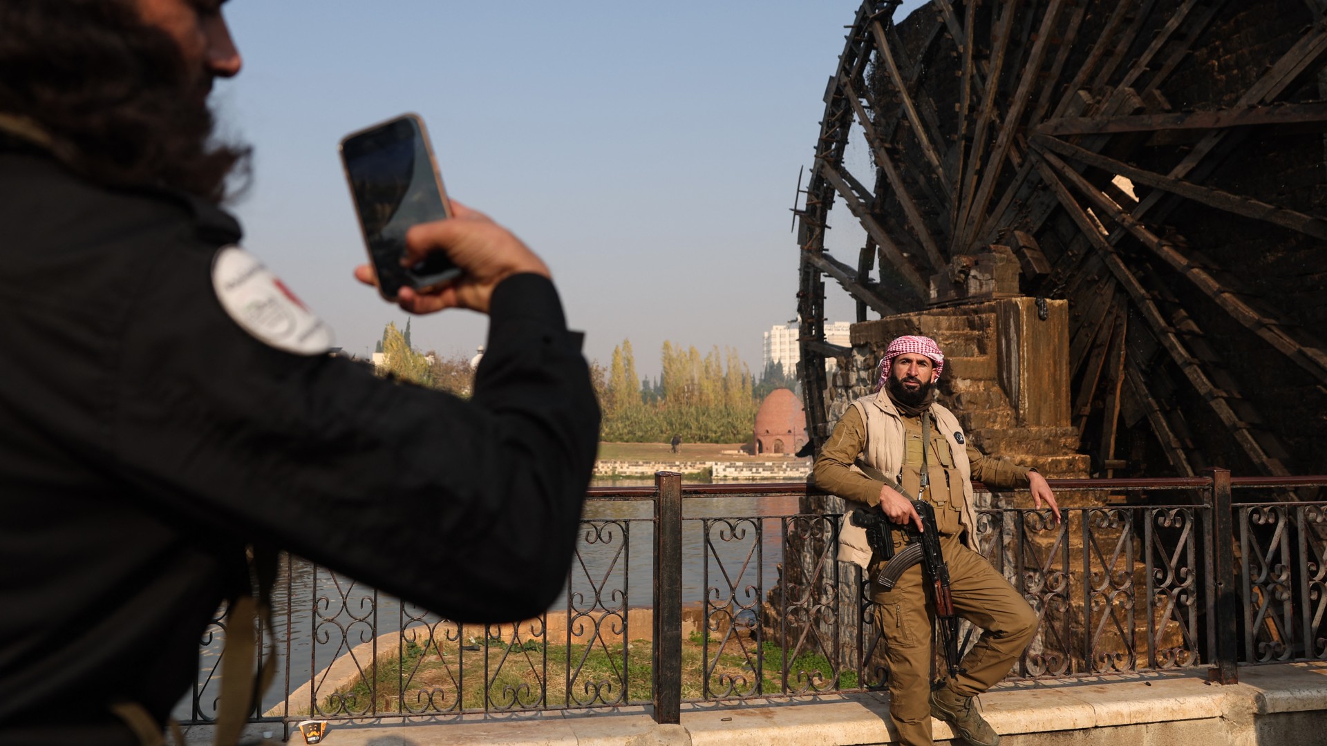 A Syrian rebel poses for a picture in front of one of the water wheels of Hama after forces captured the city on 6 December 2024 (Omar Haj Kadour/AFP)