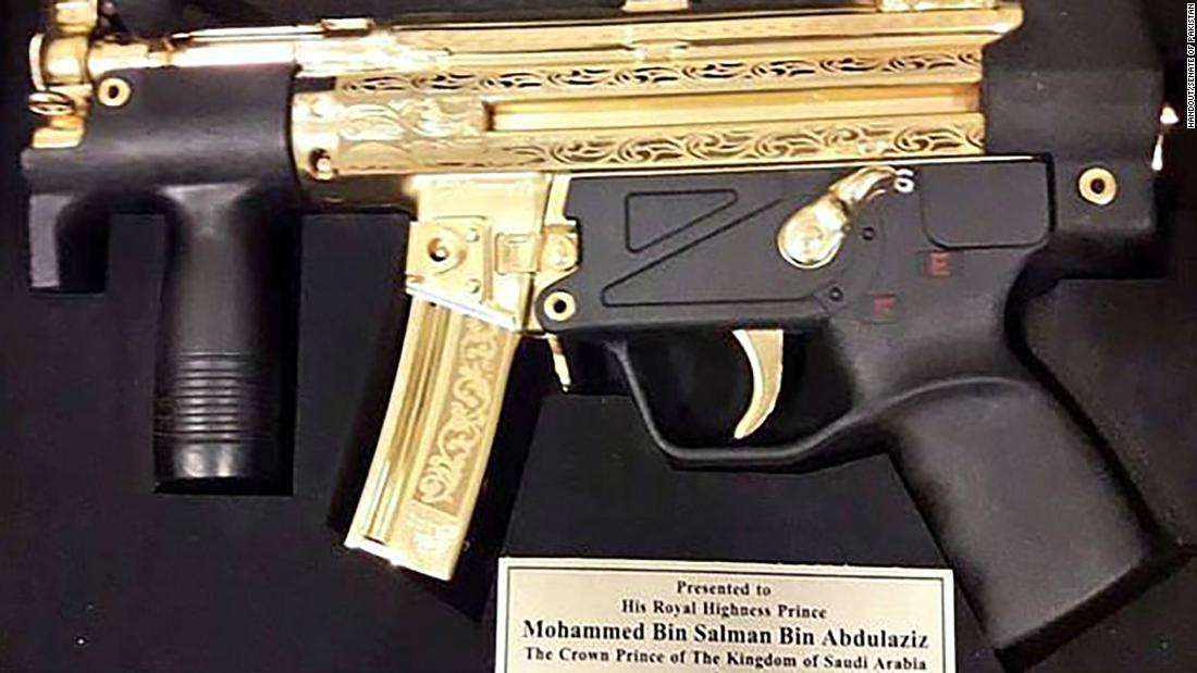 A Senate delegation went to MBS's apartment in Islamabad to personally present him with the machine gun, along with a portrait of himself, local media reported.