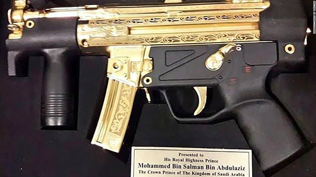 The blinged-up Heckler & Koch MP5K was presented to MBS by Senate chairman Sadiq Sanjrani after the crown prince agreed to invest $20bn in the country.