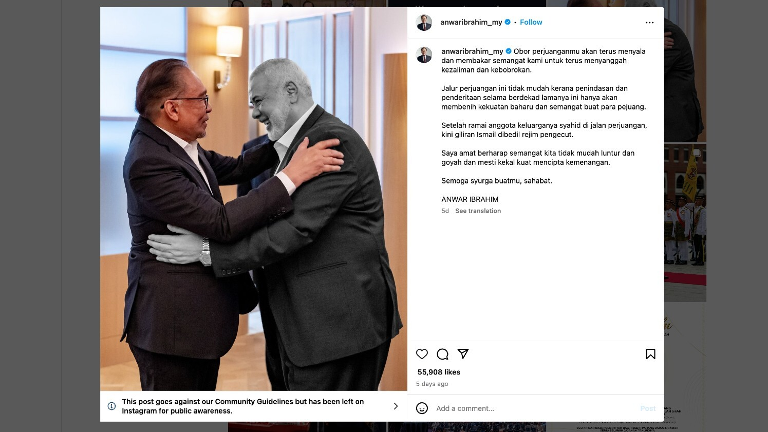 This was Meta's second run-in with the Malaysian government, following a similar incident in May, in which posts by Anwar about his meeting with Haniyeh were restored after being taken down in error.