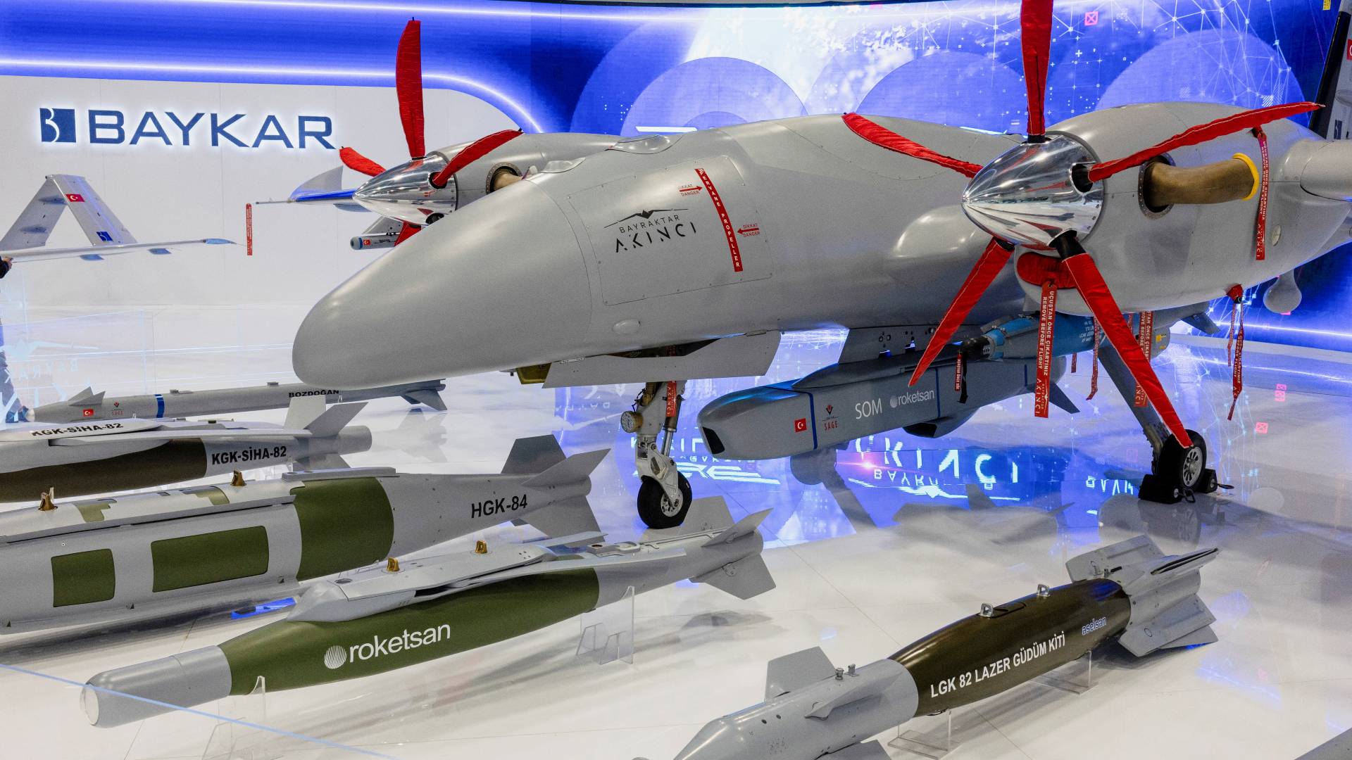 The Bayraktar Akinci unmanned combat drone at Saha Expo Defence and Aerospace Exhibition in Istanbul, Turkey, 27 October 2022 (AFP)