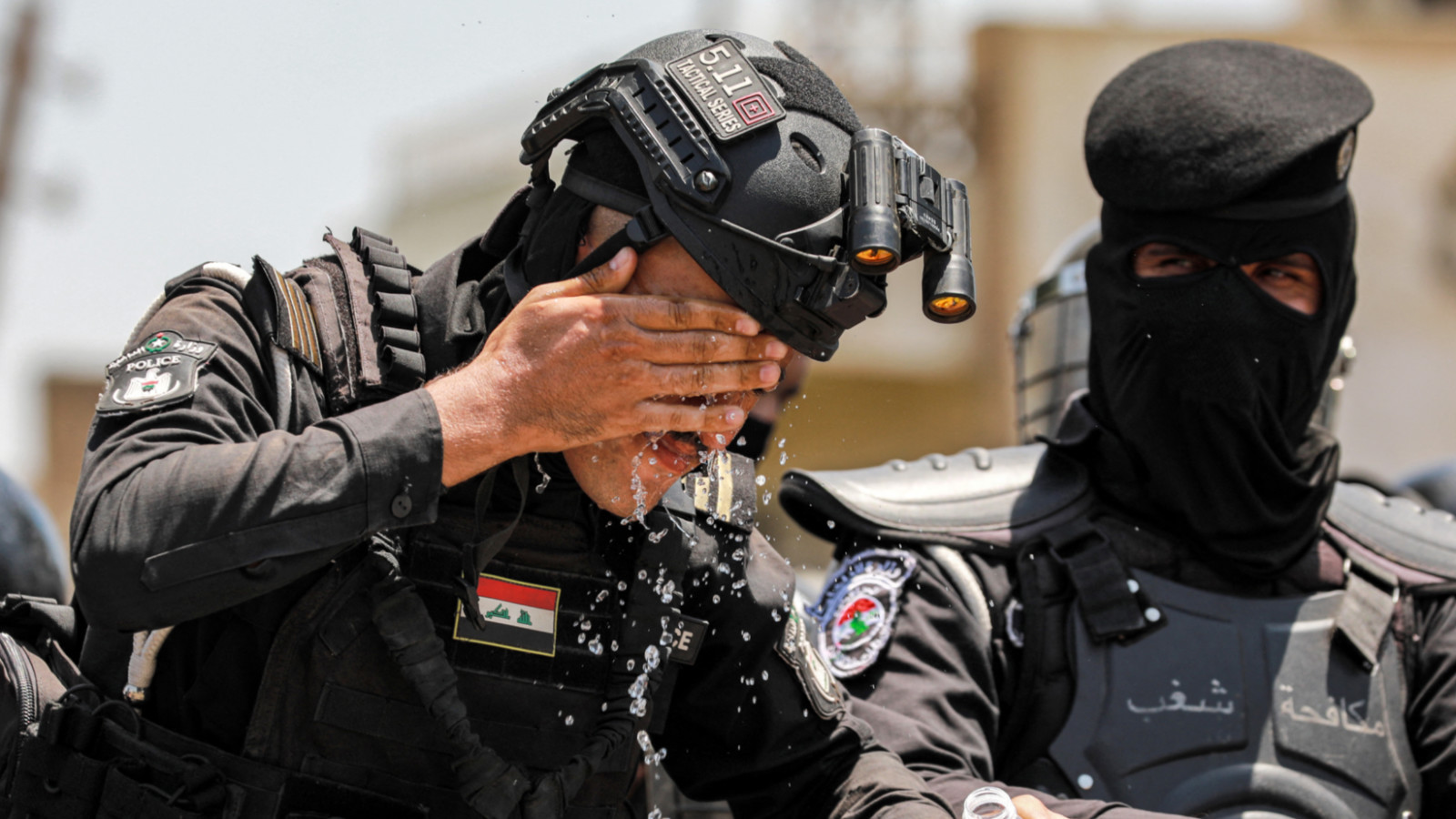 Gaza: A Palestinian girl swims in a swimming pool to cool down amid a heatwave in Khan Younis on 17 July 2023 (Reuters). Main image: Iraq: Security forces stand guard at a demonstration against water scarcity and power outages in Baghdad, on 18 July 2023 (AFP)