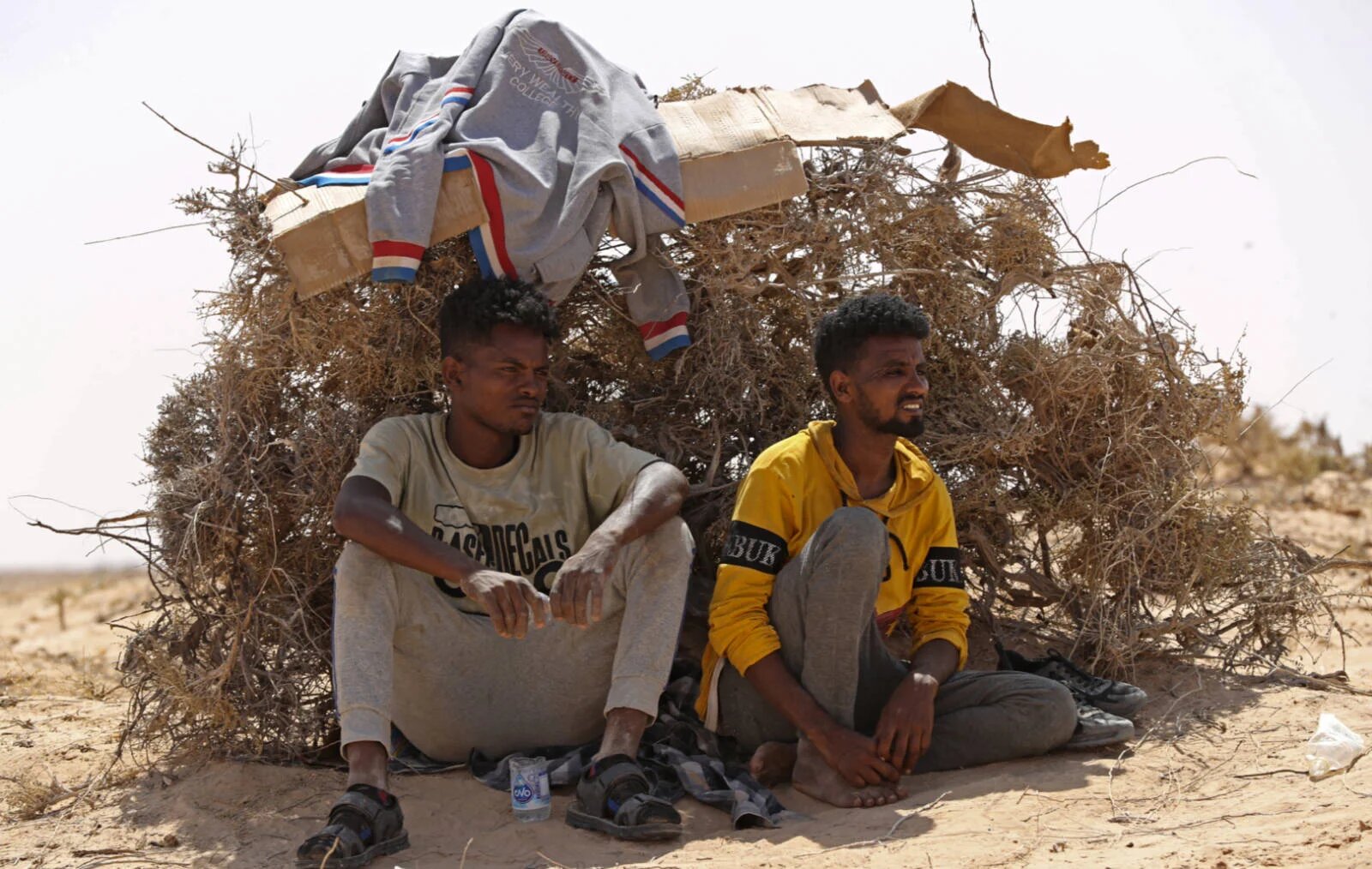 Libya: Migrants from sub-Saharan African countries, who say they were abandoned in the desert by Tunisian authorities, shield themselves from the heat in an uninhabited area near the border town of Al-Assah on 16 July 2023 (AFP)