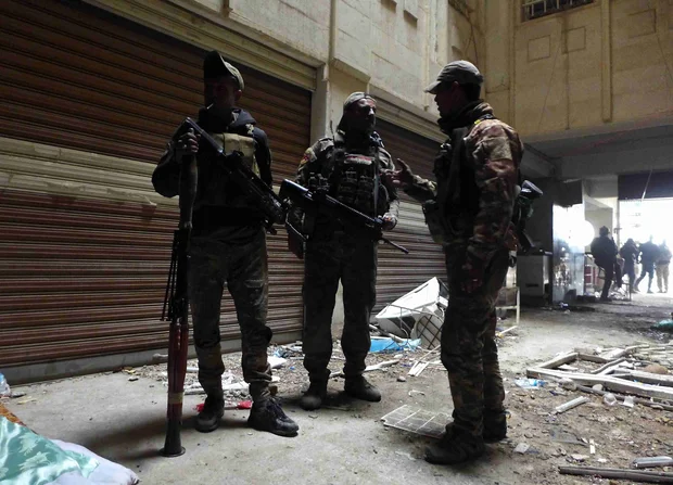 Soldiers from Iraq’s Rapid Response Division (ERD), supported by Federal Police units, have been fighting from their latest strategic gain - Mosul’s riverside indoor souk - since dawn. Gradually the forces have fanned out through a network of narrow roads leading into the adjacent old souk.