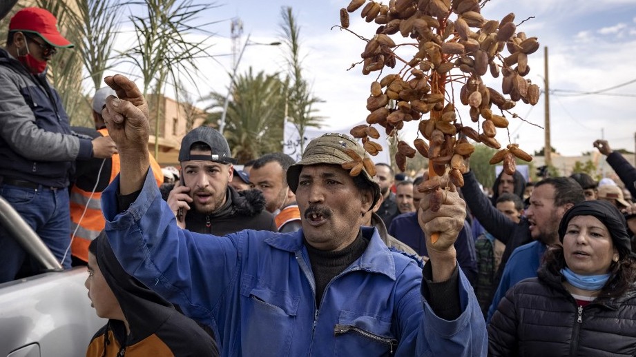 Moroccan farmers protest in the border city of Figuig on 18 March 2021 after Algerian authorities expelled the date growers from a border area (AFP)