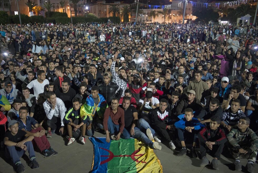 Protesters hold the Amazigh (Berber) flag in the northern city of Al Hoceima on October 30, 2016, following the death of a fishmonger, who was crushed to death on October 28 in a rubbish truck in Al Hoceima (AFP)