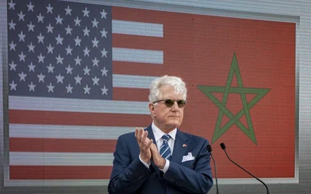 David T Fischer, US Ambassador to Morocco, standing before a US State Department-authorised map of Morocco recognising the internationally disputed territory of Western Sahara (AFP)