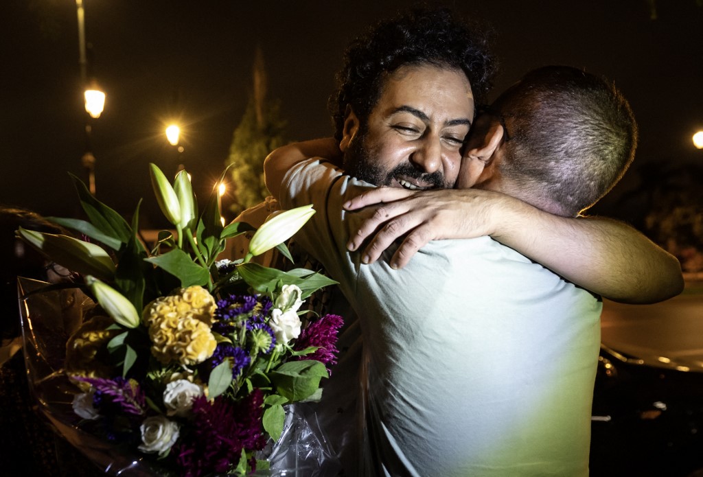 Moroccan journalist Omar Radi (left) hugs his friend after leaving prison in Rabat on 29 July (Fadel Senna/AFP)