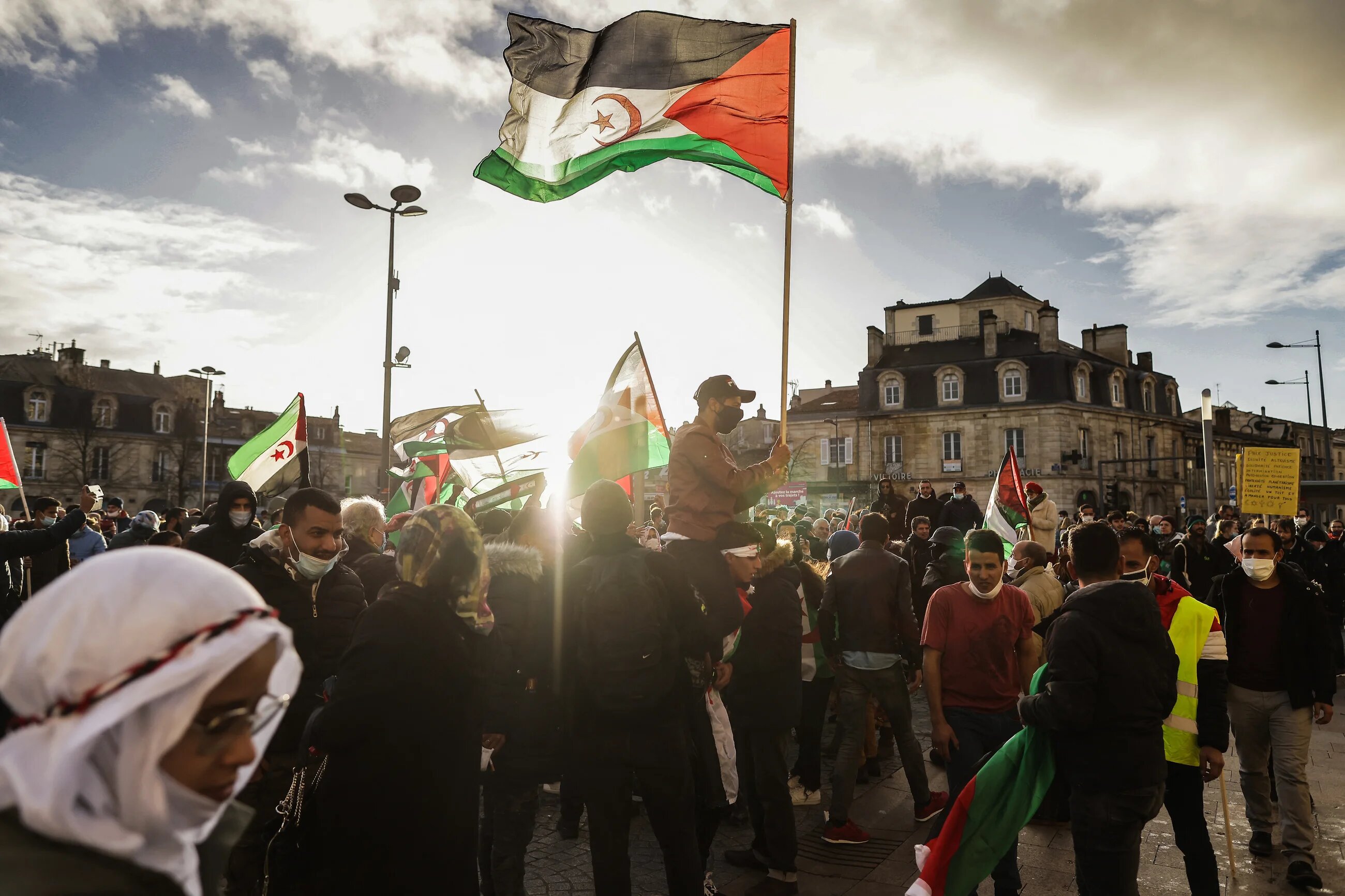 Protestors hold Western Sahara flags during a demonstration, in Bordeaux, France on 12 December 2020 (AFP)