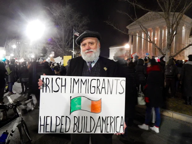 Tom Keefe, a well-dressed older gentleman, walked the crowd with a sign held high over his head that read, “Irish immigrants helped build America.” Keefe told Middle East Eye that his grandmother, Elizabeth, had migrated to the US from Ireland in 1902. “The Irish were scapegoated in those days, and I see the same disparaging of Syrian refugees,” Keefe said. “It struck me very, very deeply.” So deeply that Keefe had flown from his home in Washington state for the sole purpose of attending the protest in Washington, DC.