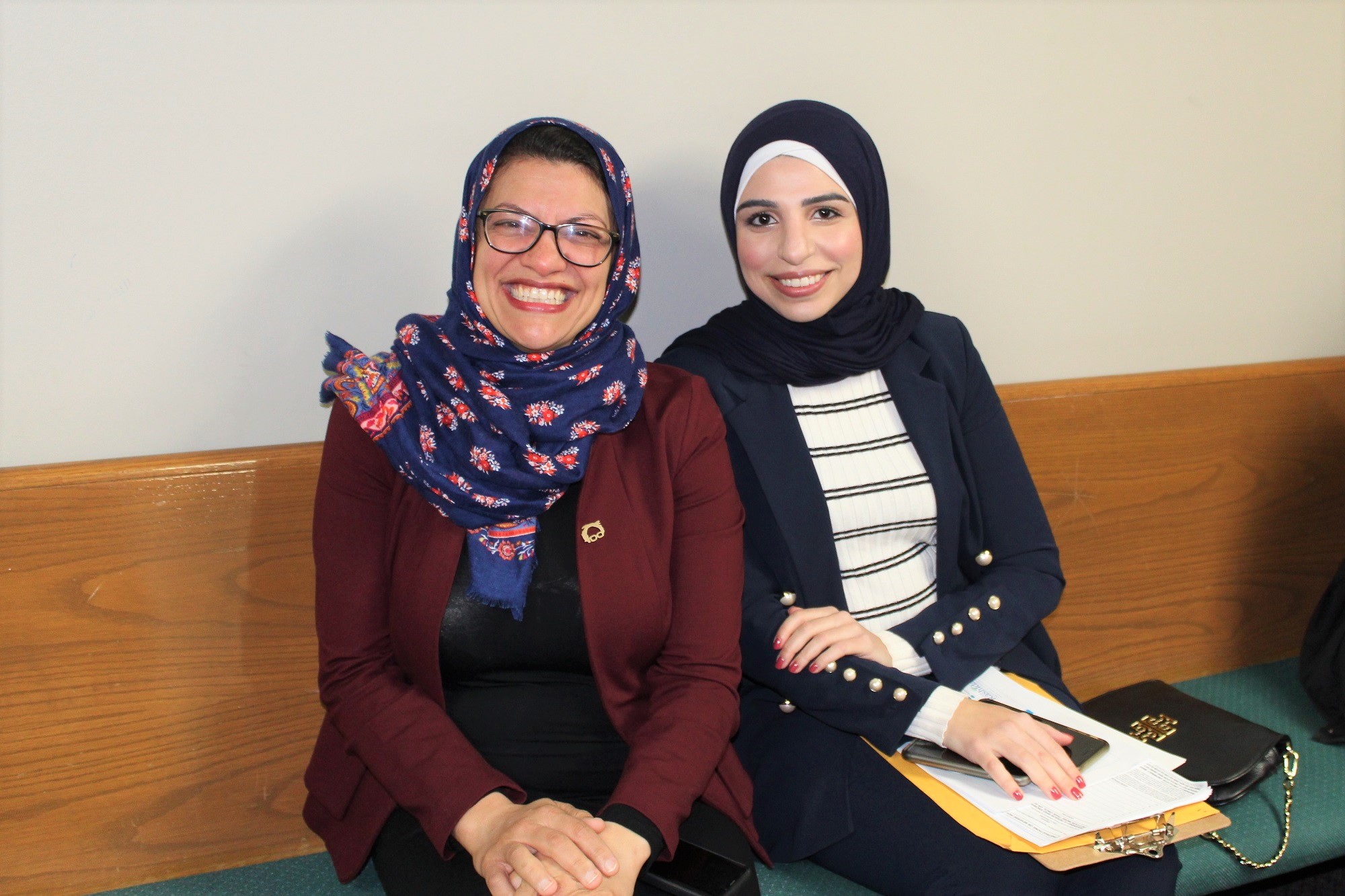 Congresswoman Tlaib (L) with one of her aides at mosque in Michigan (MEE/Ali Harb)